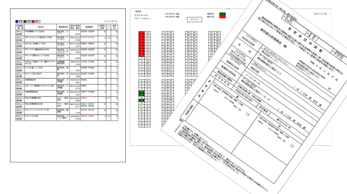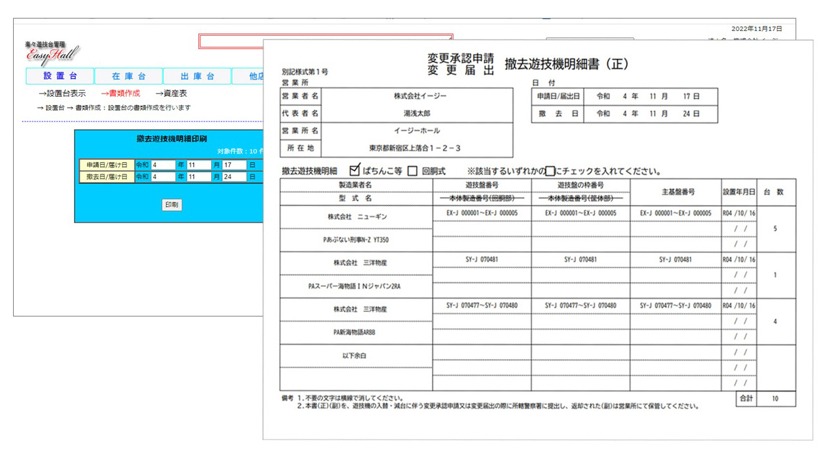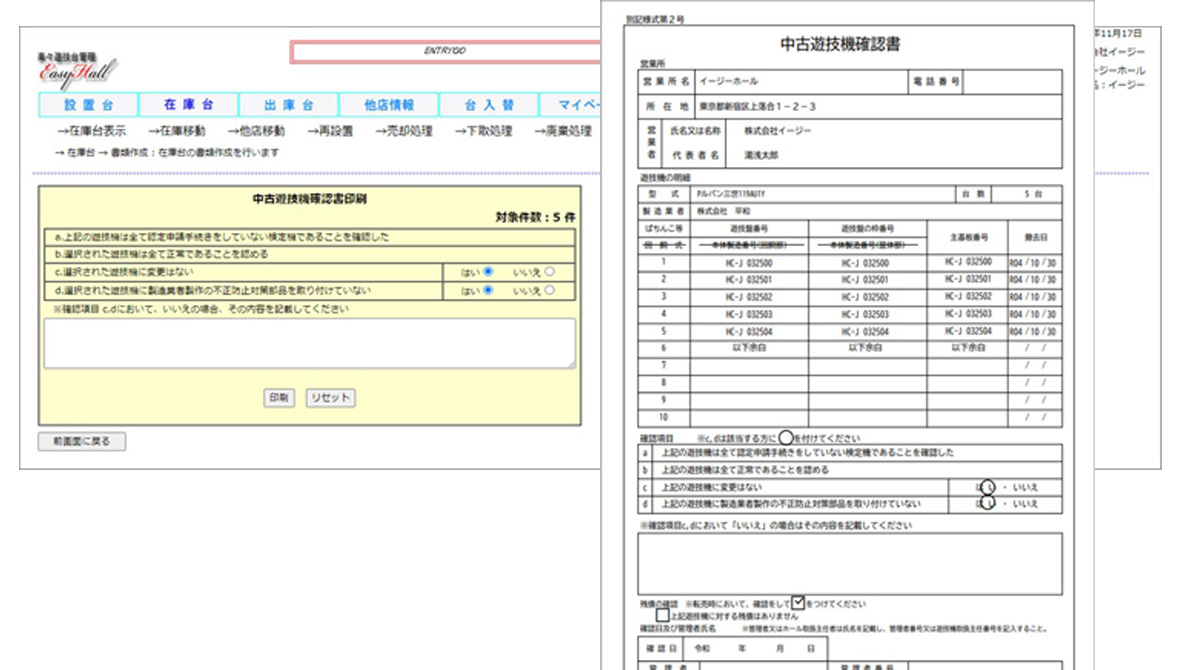 管理画面の撤去遊技機明細書作成画面では、設置中の遊技台からの撤去遊技機明細書の作成が可能です。申請日等のわずかな部分のみ入力して、プリントした書類に捺印すれば完成します。