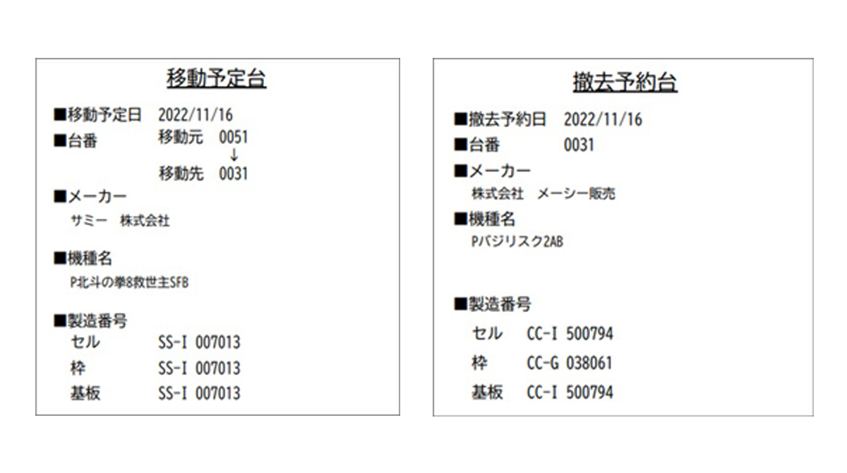 入れ替え計画を設定した後は、撤去予定台と移動予定台のラベルを出力する事ができます。こちらのラベルには1台ごとの撤去日、移動日、台番情報、製造番号などの情報が記載されており、実機に貼り付ける事により正確な管理が可能となります。