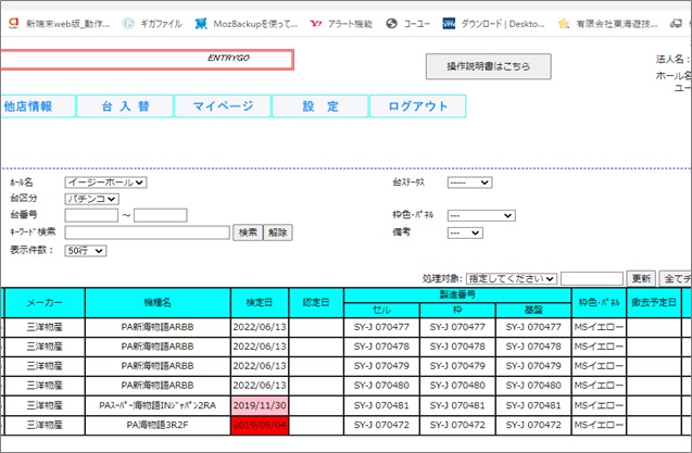 検定日、認定日の情報は検定通知書スキャンによる新台登録時に自動的に登録される形となりますが、「検定切れ90日前」「検定切」になるとそれぞれ違う色でデータが反転してその旨を告知してくれる機能があります。入替え時のうっかりを防止します。