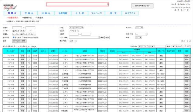 メーカー名、機種名、製造番号、枠色など様々な情報を管理する事が出来ます。必要な台の情報を検索画面からすぐに探す事もできます。本部権限では全てのチェーン店のが設置台及び在庫台の確認が可能です。