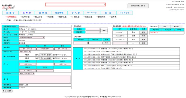 新台登録から出庫までの台履歴をリアルタイムで確認する事ができます。はじめに設置された日付や操作担当者の情報、その後の移動・売却履歴など全てシステム上から検索する事ができます。
